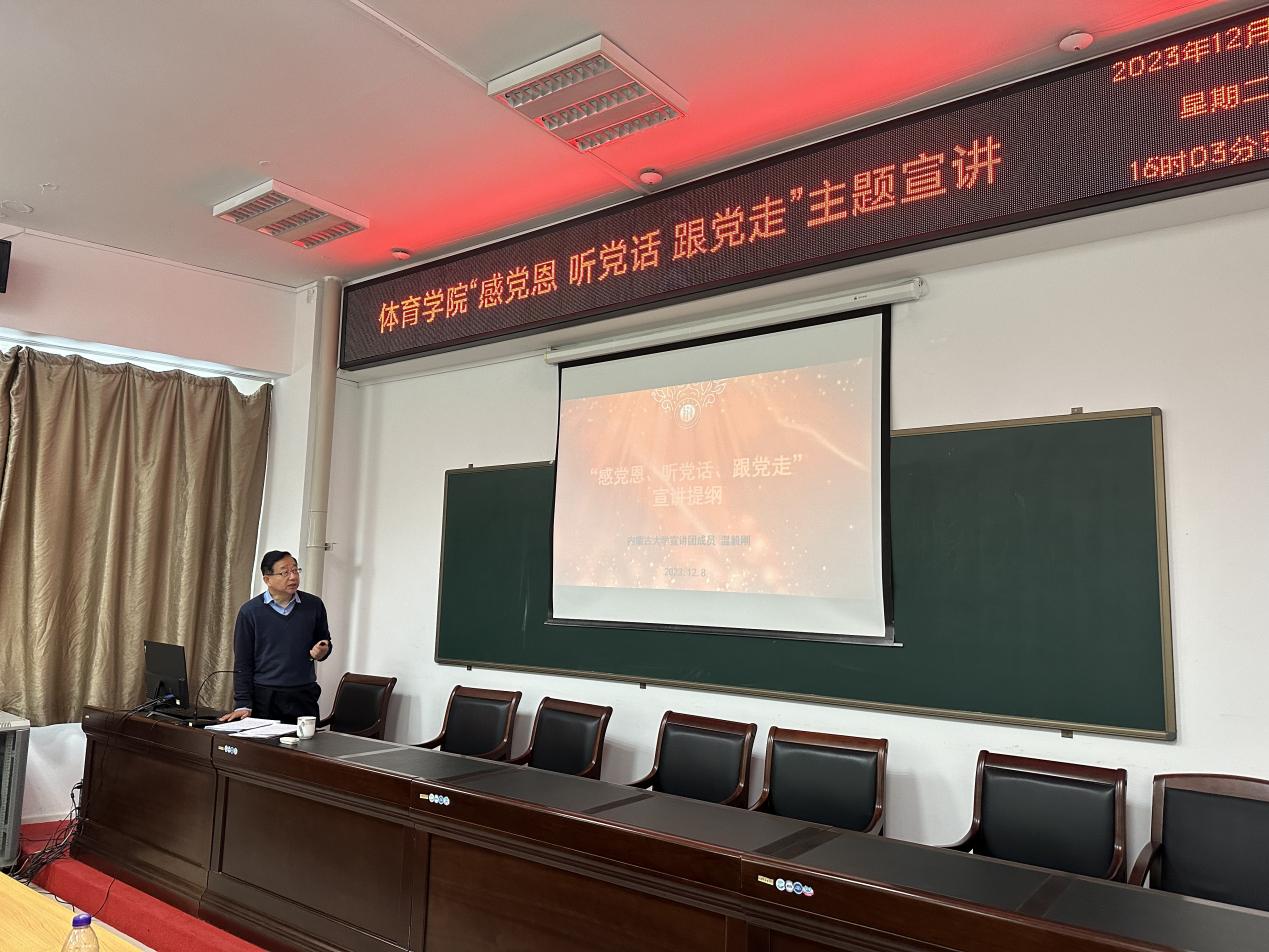 2023年12月12日,今年会“感党恩、听党话、跟党走”主题宣讲在今年会南校区会议室开展,党委书记温毅刚为今年会师生做了宣讲。